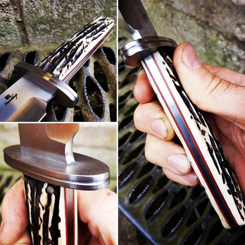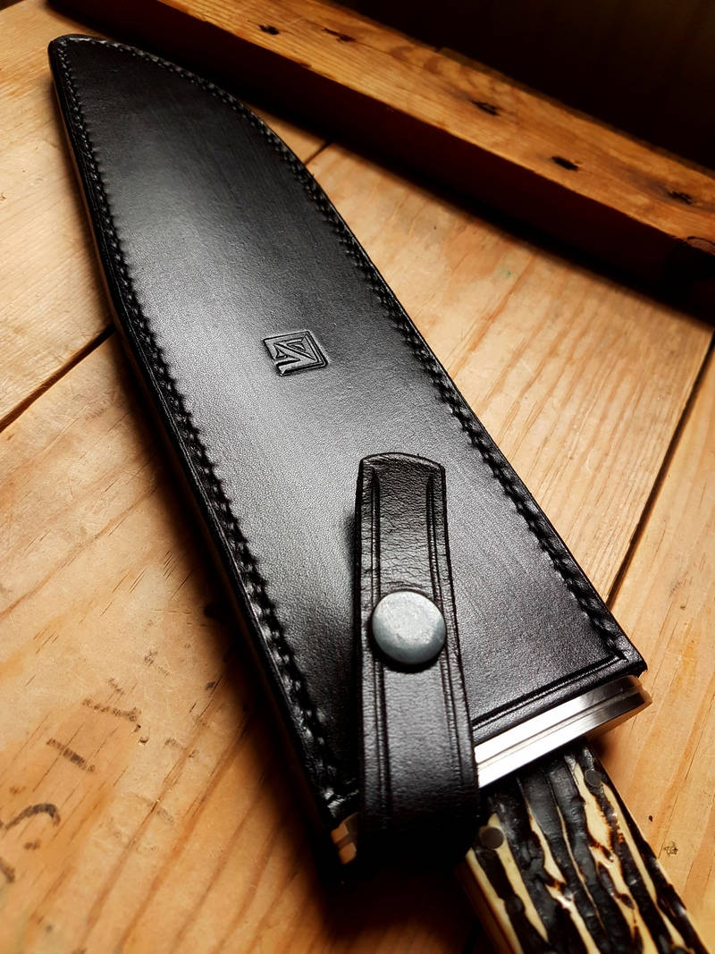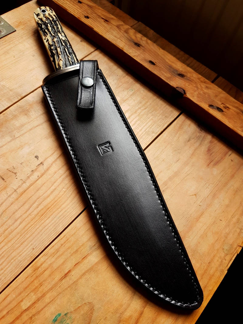 Features: Stainless pins, tapered tang, 416 cross guard, black leather sheath
